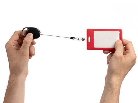 Ретрактор крепится к одежде с помощью карабина, а с другой стороны можно поместить бейдж, визитку или магнитную карту. В корпусе спрятан сворачивающийся шнур, который позволяет при необходимости демонстрировать содержимое держателя, не снимая его.