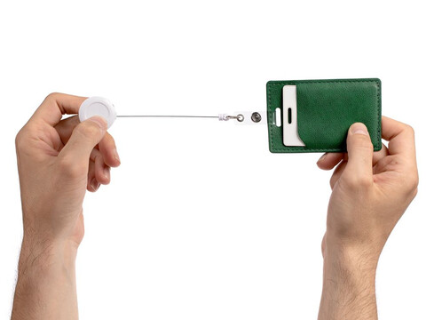 Ретрактор крепится к одежде, а с другой стороны можно поместить бейдж, визитку или магнитную карту. В корпусе спрятан сворачивающийся шнур, который позволяет при необходимости демонстрировать содержимое держателя, не снимая его.
