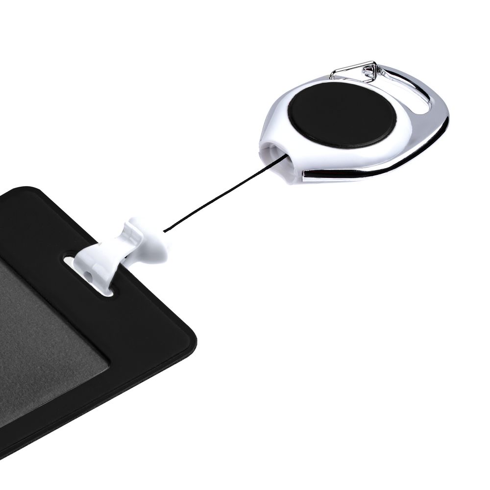 Ретрактор крепится к одежде с помощью клипа или карабина, а с другой стороны на можно подвесить бейдж, пропуск или магнитную карту. В корпусе спрятан сворачивающийся шнур, который позволяет при необходимости демонстрировать содержимое держателя, не снимая его.