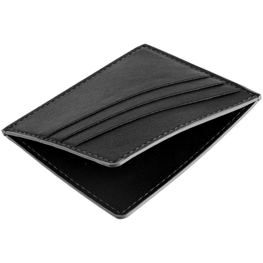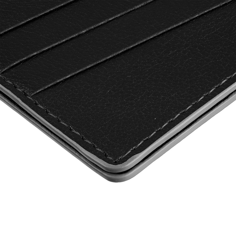 Чехол выполнен из материала Petrus, черный АА, дополнен окрашенным срезом края и внутренним карманом из серого картона. Имеет 4 отделения для кредитных карт и 1 отделение для купюр.