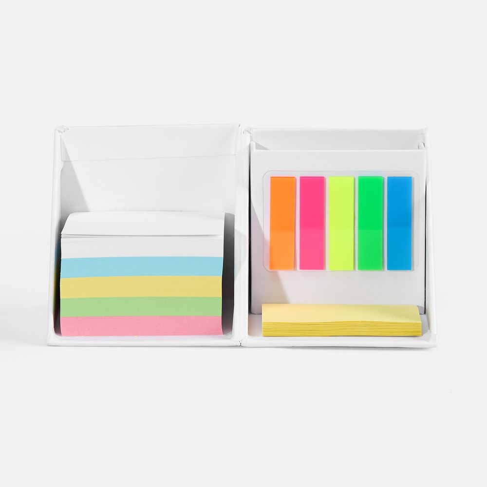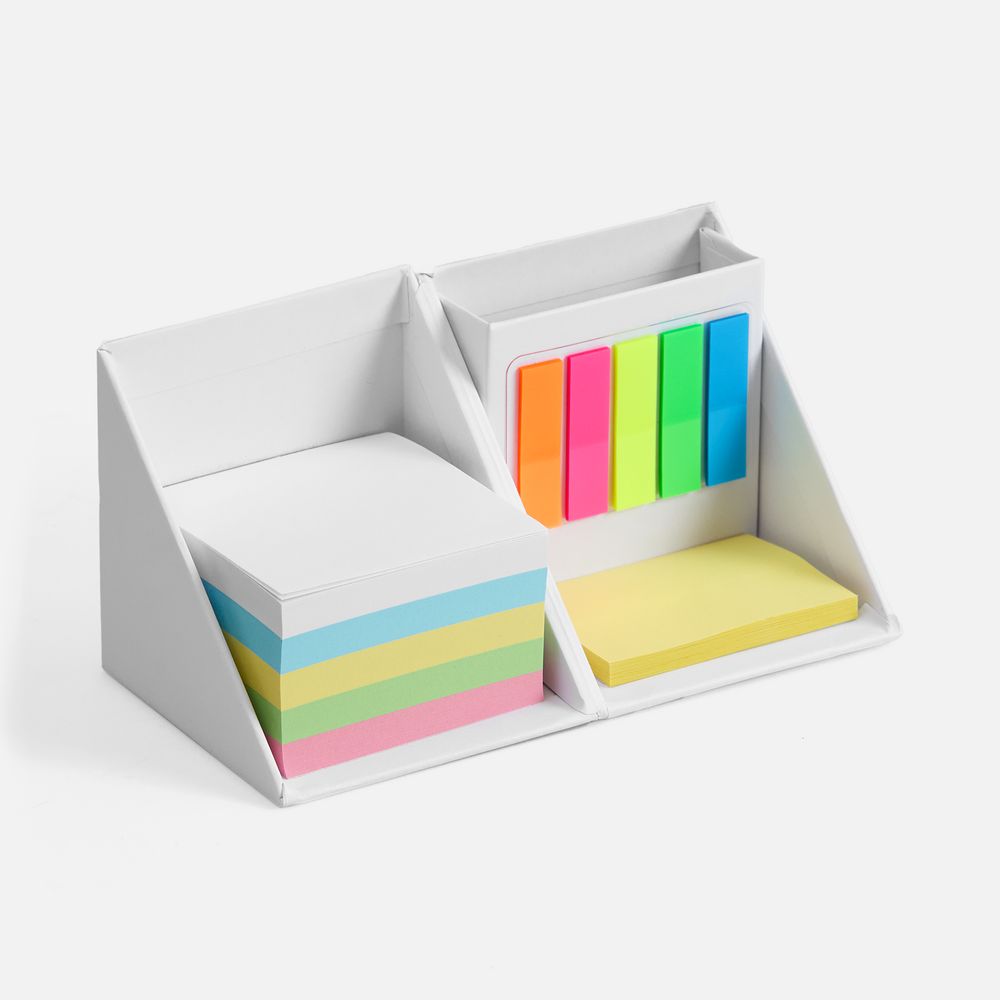 Настольный набор в подставке-кубарике: Блок бумаги: 500 листов, 5 цветов, плотность 70 г/м²; Блок листов с клейкой полосой: 50 листов; Пластиковые...