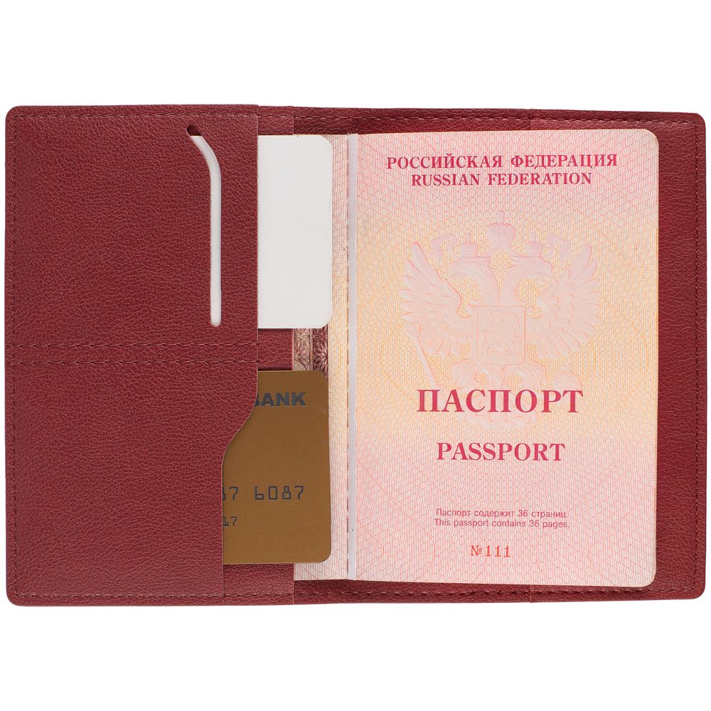 Обложка выполнена из материала Petrus, красный PP. Срез обложки окрашен в серый цвет. Имеет основное отделение для паспорта и 2 кармана для визиток или...