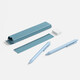 Ручка, механический карандаш, ластик и линейка в коробочке, которая в дальнейшем может служить компактным пеналом.