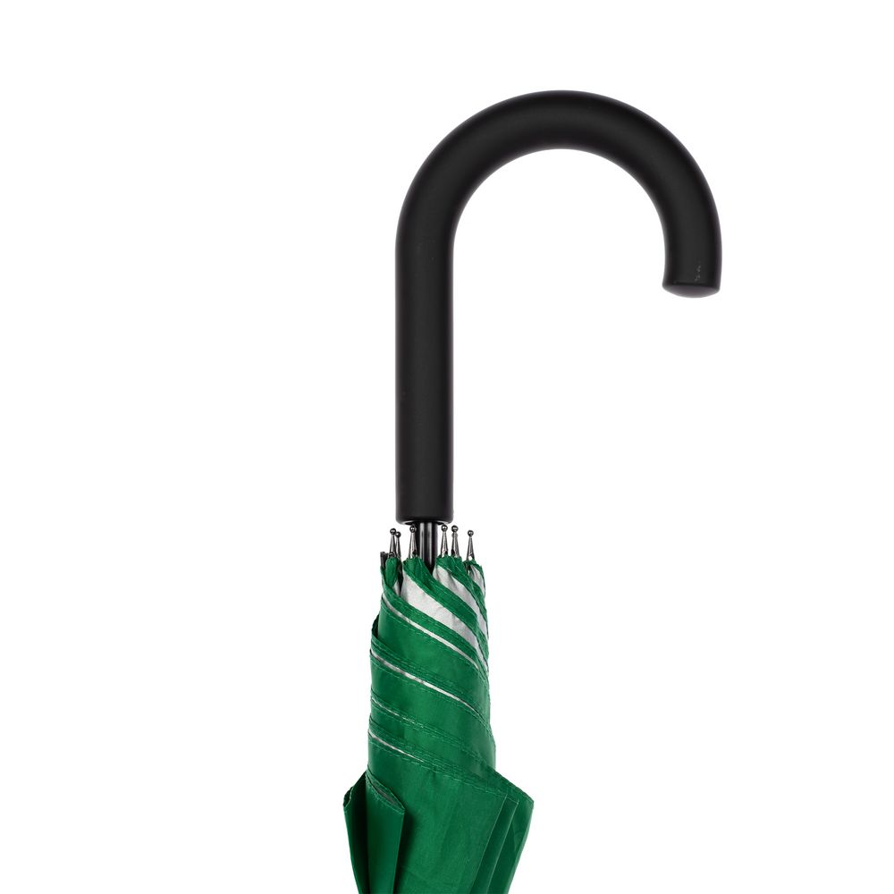Легкий зонт-трость классической формы, который выглядит нескучно благодаря современным деталям исполнения — серебристому покрытию на внутренней части купола и мягкой прорезиненной ручке.