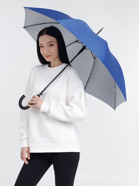 Легкий зонт-трость классической формы, который выглядит нескучно благодаря современным деталям исполнения — серебристому покрытию на внутренней части купола...